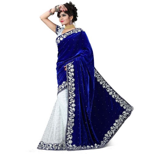 V-Art Women's Velvet & Net Saree (SABLUEVAL_Blue & white)